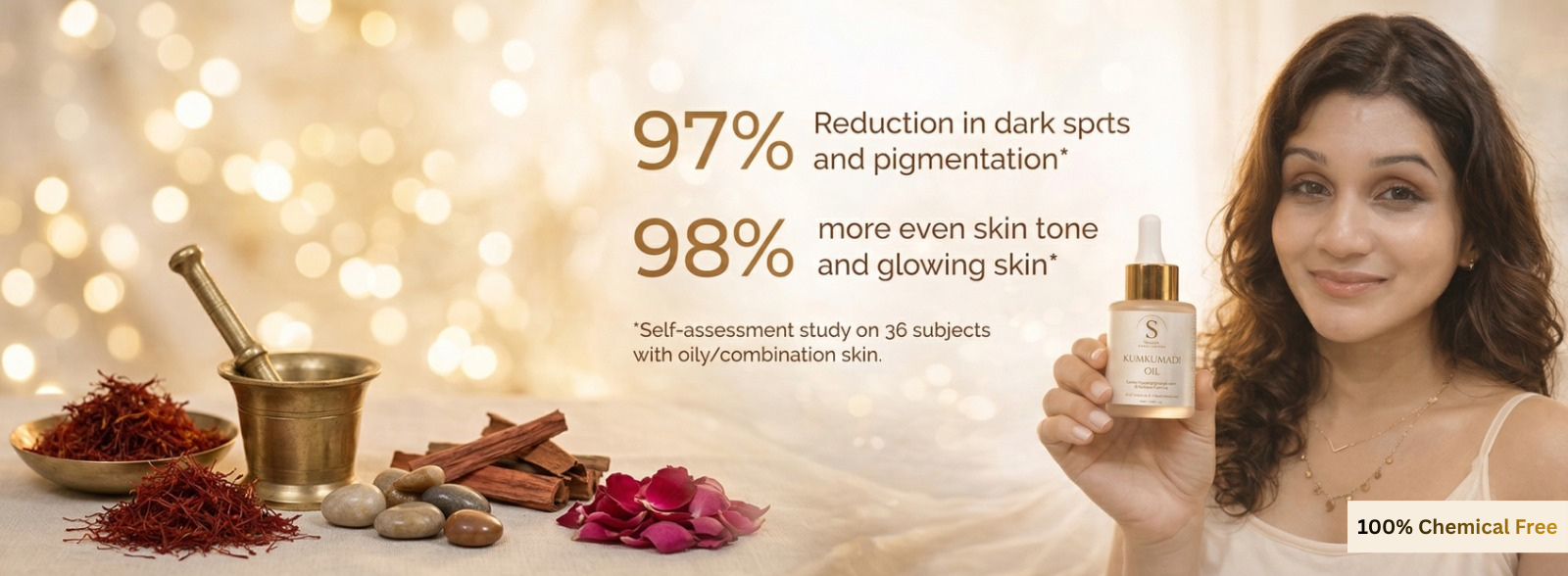 - Kumkumadi Herbal Blend: Supports skin glow and clarity